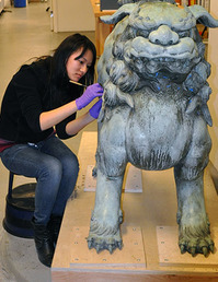 Lion figures traditionally serve as symbolic guardians outside temples and shrines in Japan, and the custom continues at many public buildings today. In the case of a museum, however, conservators and other specialists return the favor, working to protect the sculptures from weather and damage.