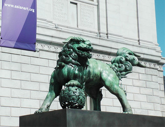 In 2011, a private donor offered the Asian Art Museum a pair of monumental bronze Japanese lions. Lions like these serve as guardian figures at Buddhist temples and Shinto shrines throughout Japan, but the extraordinary size and dynamic pose of these two make them a perfect fit for the museum’s grand front entrance.