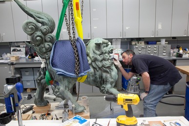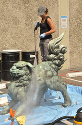 After a thorough examination including metal analysis, radiography, and even a look inside the hollow bodies, the surface of the lions was thoroughly cleaned. Elizabeth Saetta, a conservator specializing in sculpture, used pressurized water to reduce surface corrosion.