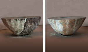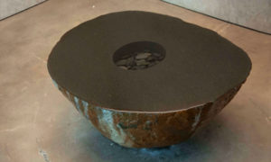 Masatoshi made the work from a Japanese basalt boulder cut in half; he polished the cross section by hand with water and abrasive stones for many months, until it achieved a mirror-like smoothness. Water pumped from below into the central well runs across the top and down the sides of the stone so smoothly and silently that it appears to be completely still.